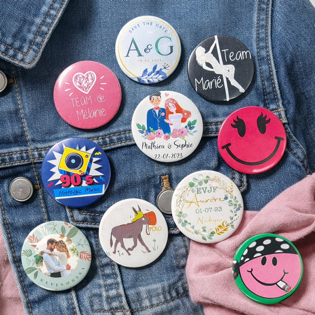 Démarquez-vous à chaque événement ! Badges personnalisés pour mariage, baptême, EVJF, baby shower, et plus encore. Personnalisation totale : inscription, motif, couleur, photo. Pas de quantité minimum. Faites de chaque instant un souvenir unique. Commandez dès maintenant.