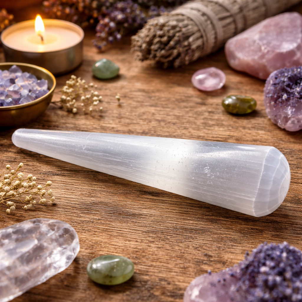 La sélénite est une pierre lunaire : rechargez-la à la lumière de la pleine lune ou en la déposant sur une géode d’améthyste ou sur un amas de quartz pendant 24 heures.
