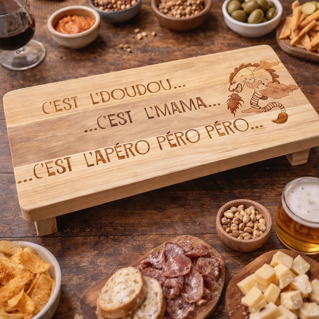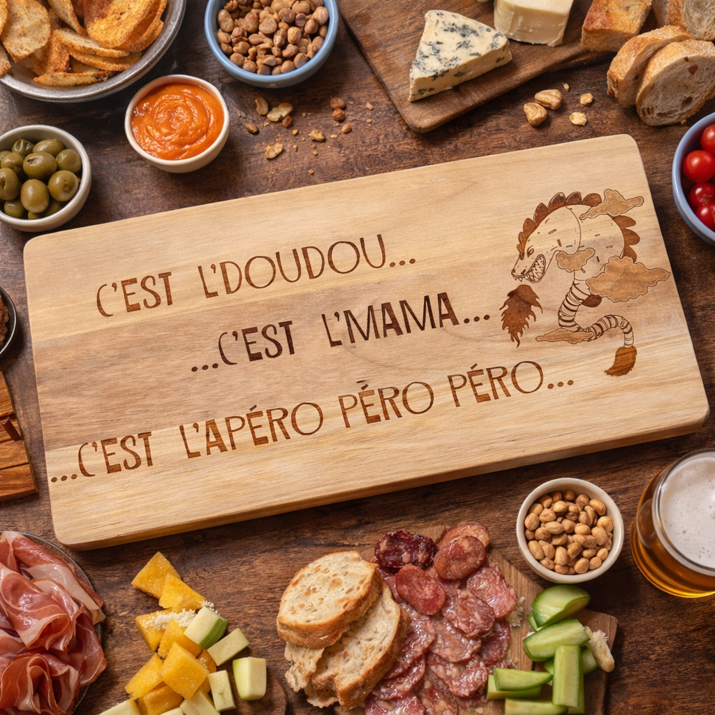 Fabriquée en Teck, elle allie élégance naturelle et artisanat authentique. Son inscription originale, « C'est l'DouDou c'est mama c'est l'apéro péro péro » , rend hommage à la légende tout en apportant une touche unique à vos moments conviviaux.
